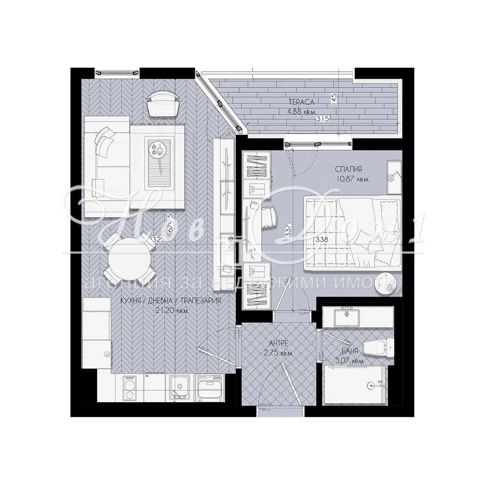 Апартаментът представлява: входно Антре, Дневен Тракт + Трапезария + Кухн.Бокс с изход към разкошна Тераса, която е обща с топла Спалня, Баня + Тоалетна, прилежащо Мазе около 5м2.