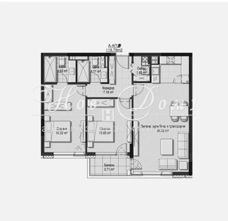 Апартаментът представлява: Голяма всекидневна – 34.4м2; Основна Спалня – 16.3м2 със собствена тоалетна и баня – 4.6м2; Втора Спалня – 13.9м2; Баня с тоалетна – 4.1м2; Балкон с изход към малката спалня и всекидневната – 3.7м2; Антре – 7.1м2; Склад – 1.9м2. Разположен на 2ти от 11 етажа в уникална нова сграда разположена на ТОП локация в кв. Кръстова Вада. Безупречно изпълнение на сградата от доверни строители с луксозни общи части. В близост до булеварди Черни Връх, Филип Кутев и Симеоновско Шосе, което му дава лесен достъп до останалата част на града.
