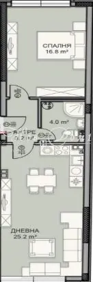 Просторна дневна с кухненски бокс – 25.2 м², позволяваща обособяване на удобна холова и трапезна зона; голяма спалня – 16.8 м² с правилна форма и лесно обзавеждане; баня с тоалетна – 4.0 м²; функционално антре; тераса – 3.5 м²; складово помещение.