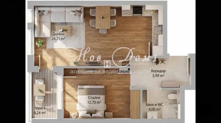 - Просторна дневна с кухненски бокс – 26,21 м²