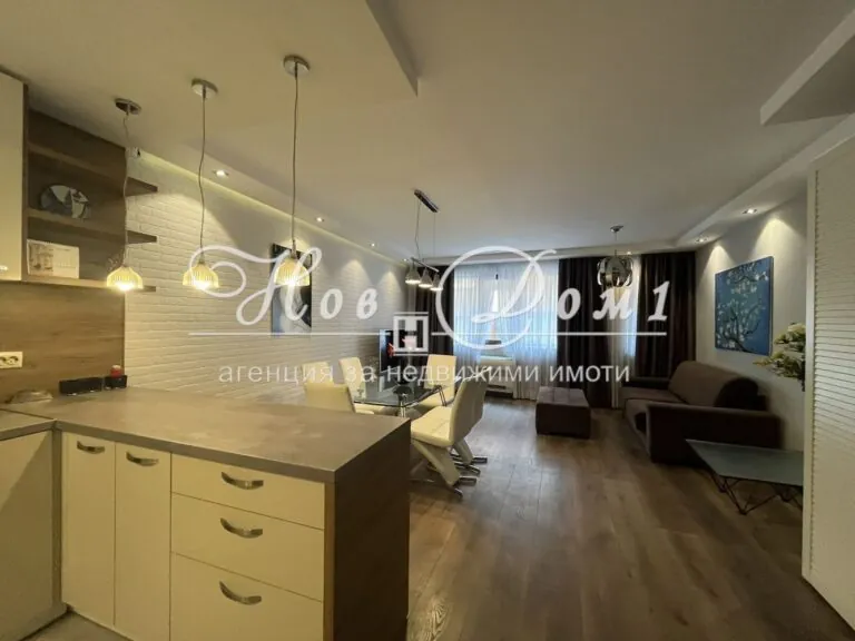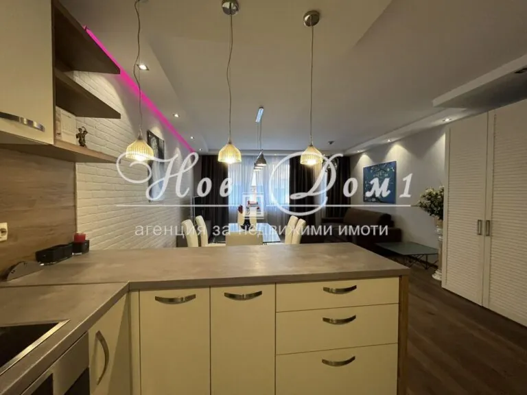 - Просторна дневна с дизайнерски мебели и кухненски бокс, оборудван с последно поколение електроуреди