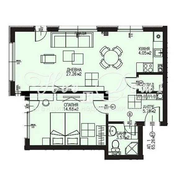 Апартаментът представлява: входно антре с място за портамнто и гардероб, прострна и светла Дневна с кухненска част над 31кв.м., с излаз на тераса/двор, Спалня 15кв.м., Баня с тоалетна, както и складово помещение.