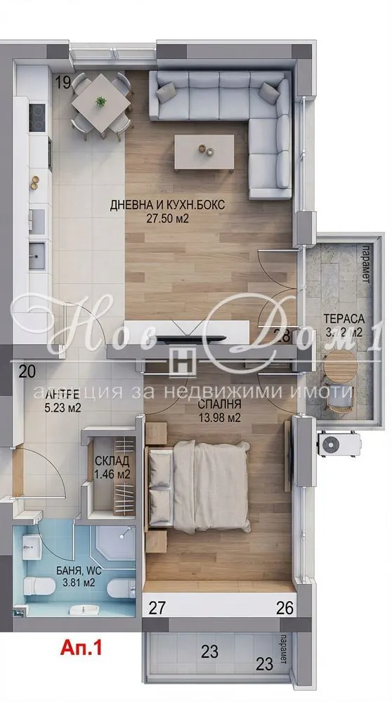 🛋 Дневна с кухня и трапезария – 27.50 м²
