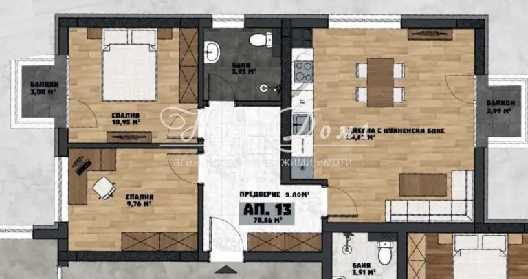 📐 РАЗПРЕДЕЛЕНИЕ Обща площ: 95.42 м² / Чиста площ: 78.56 м²