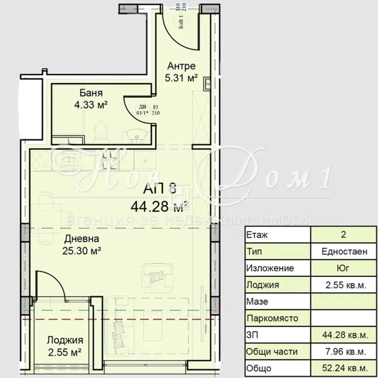 – **Обща площ:** 52 кв.м.