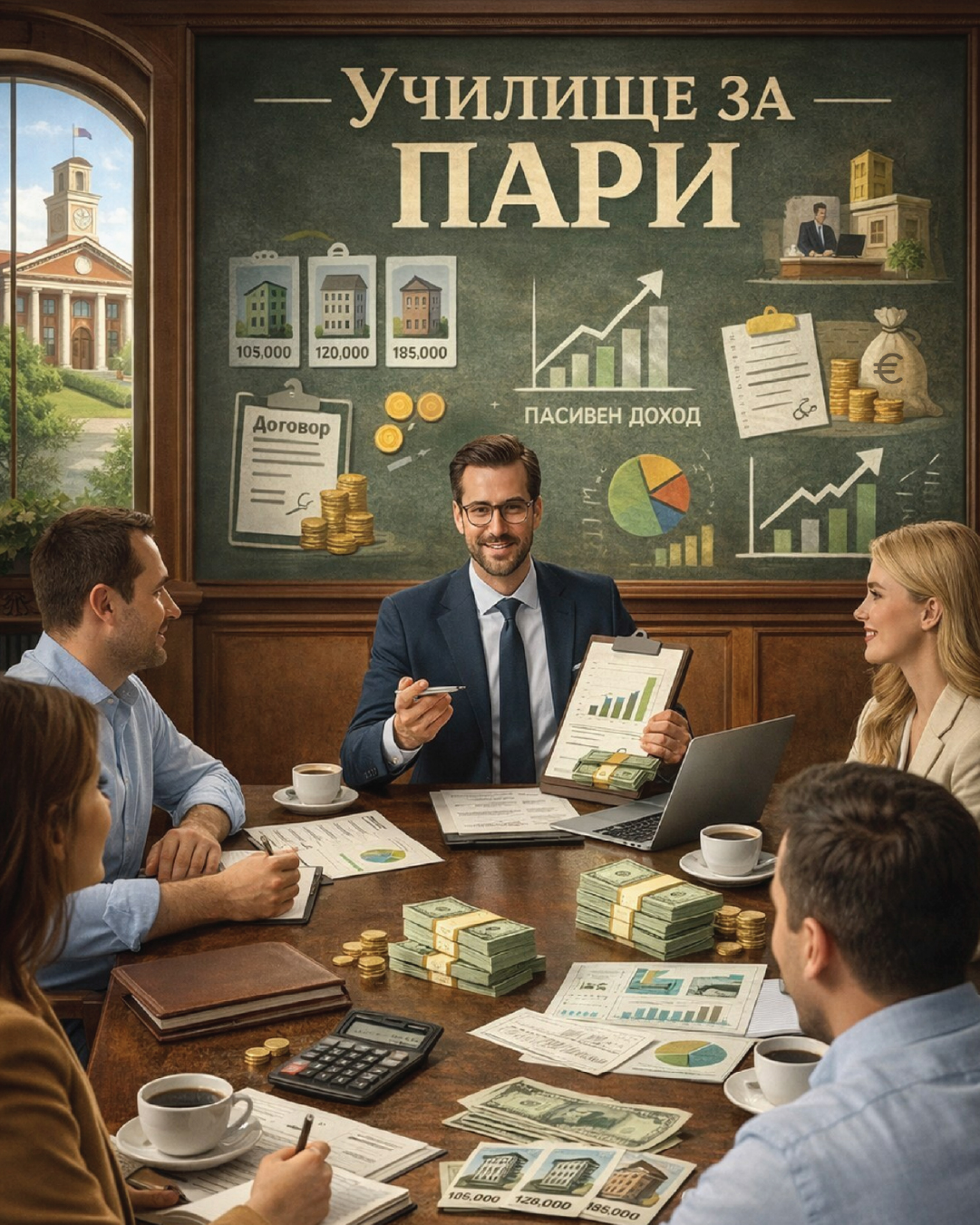 „Училище за пари“ е първата в България петстепенна обучителна програма, която комбинира теория и практика, като целта е консултантът да умее не само да продава имоти, а да управлява пари, риск и инвестиции. Кандидатствай в София, Варна, Пловдив!