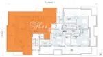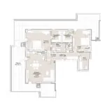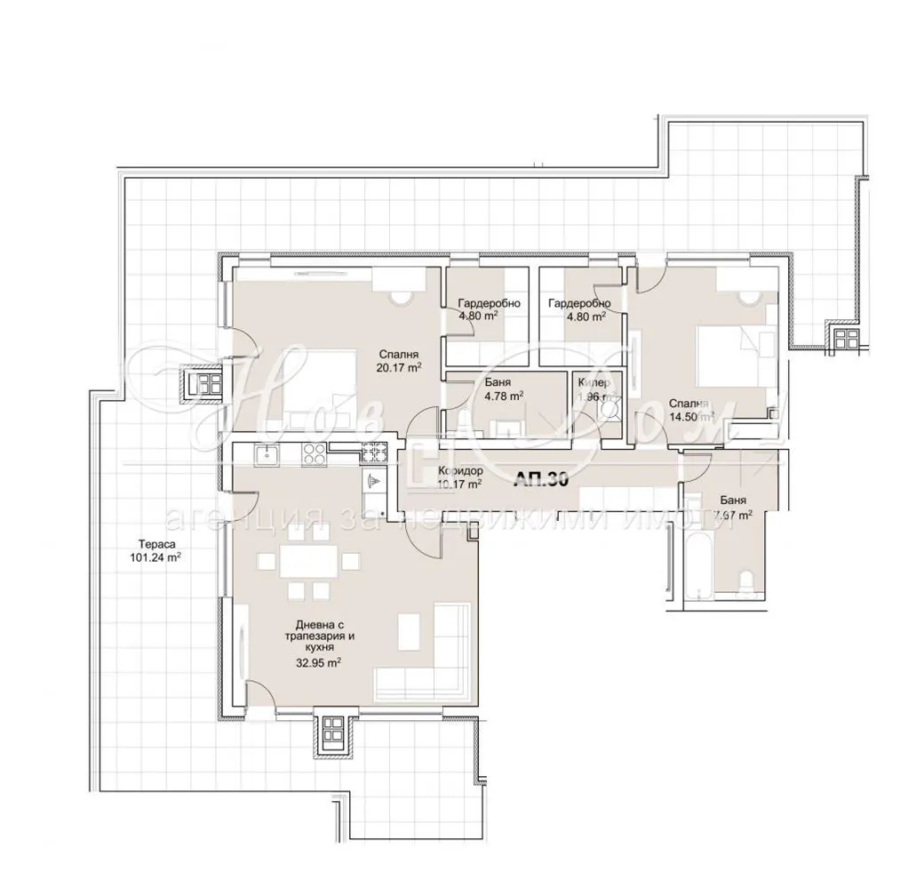 Дневната на този имот е с впечатляващите 33м2 площ, а Спалните са съответно по 30м2, и 20м2 с включени Дрешници и Баня към едната.