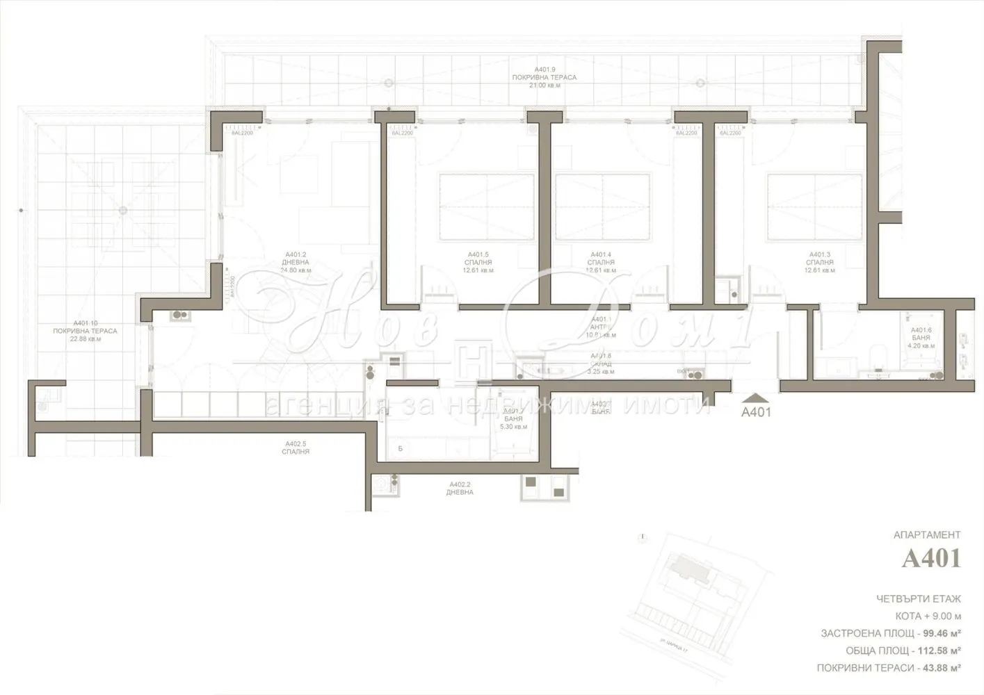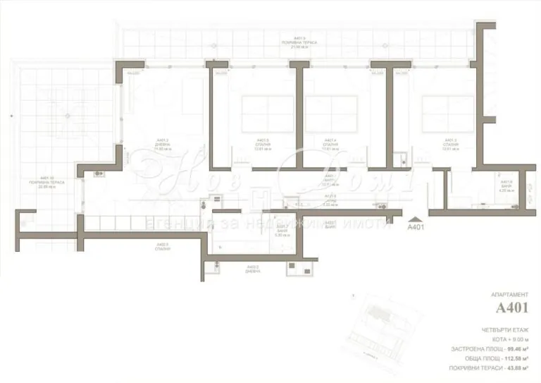 Дневна 25 м2! Тераси 44 м2! 3 непреходни спални! Правилни форми! Последен етаж!