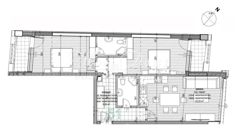 - Балкон към първа спалня с площ 4 кв. м.;
