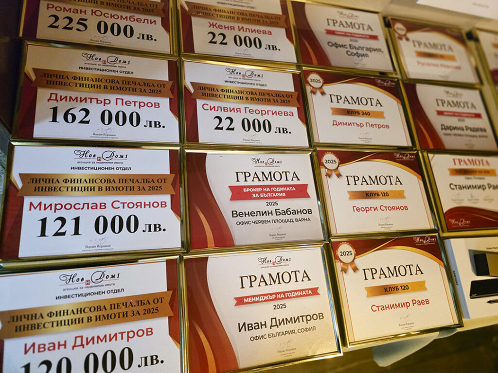 Агенцията за недвижими имоти “Нов Дом 1” за поредна година отчете успехите на своите консултанти, които се включват в инициативата “Училище за пари”. На 17 януари в рамките на годишната среща на компанията, която работи с български и международни клиенти в три големи български града – София, Варна и Пловдив, най-успешните консултанти, реализирали лична печалба от инвестиции в имоти, получиха признание за своя успех. През 2025 г. те са реализирали лична печалба от инвестиции в имоти между 22 и 225 000 лв.